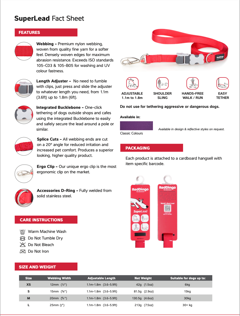Red Dingo Multipurpose SuperLead adapts to suit any lifestyle - from strolling through busy markets or running forest trails. Smooth on-the-go adjustability 1.1m - 1.8m (3'6" - 6'), one-click tethering and a versatile waist strap make walking a breeze. A versatile leash with hands-free control, on-the-fly length adjustability and a replaceable attachment clip. SuperLead redefines the humble lead.