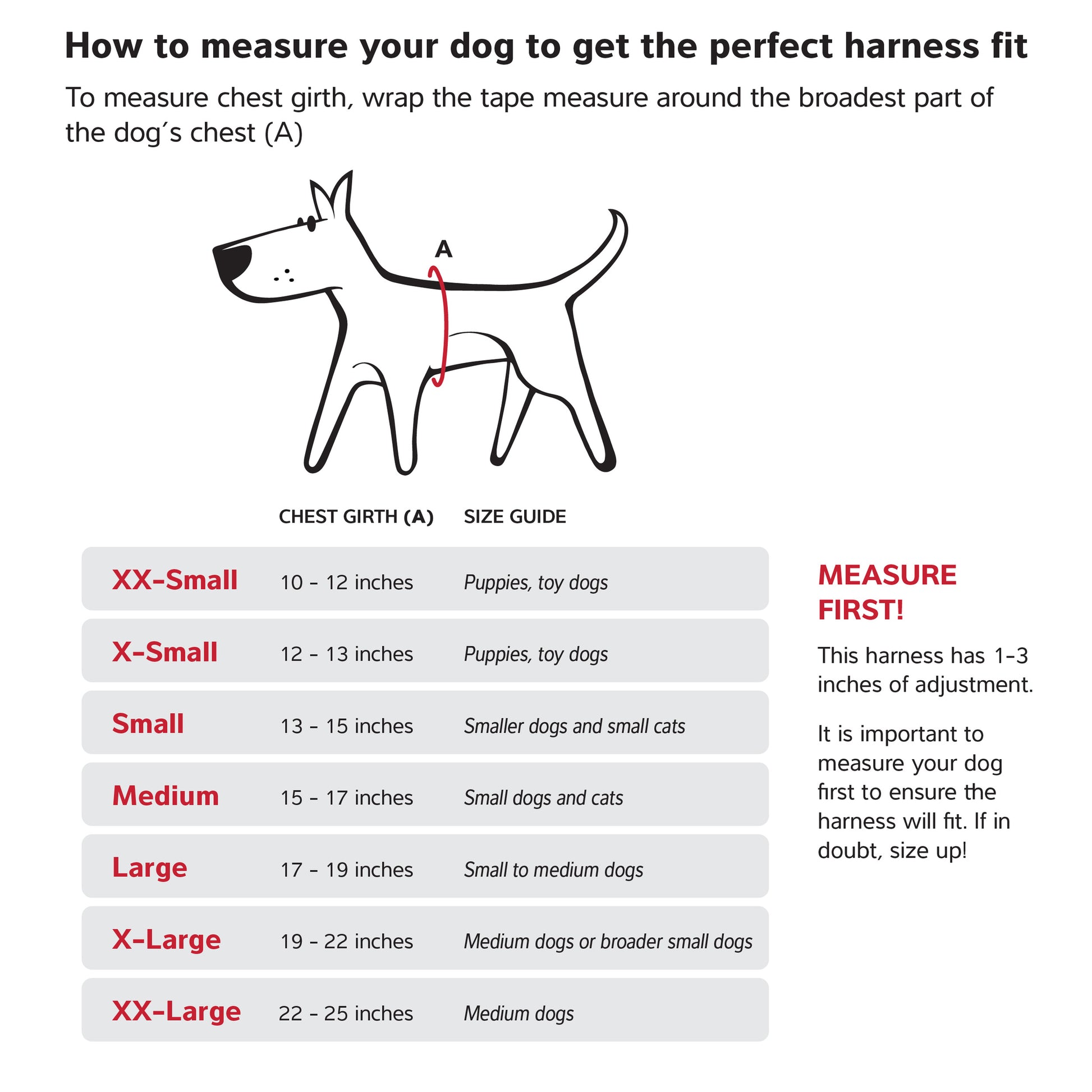 These harnesses have a small amount of adjustability. Ensure the size will fit your dog's measurements. Measure your dog's body loop (Behind front shoulders) (A) and compare it to the size chart below.