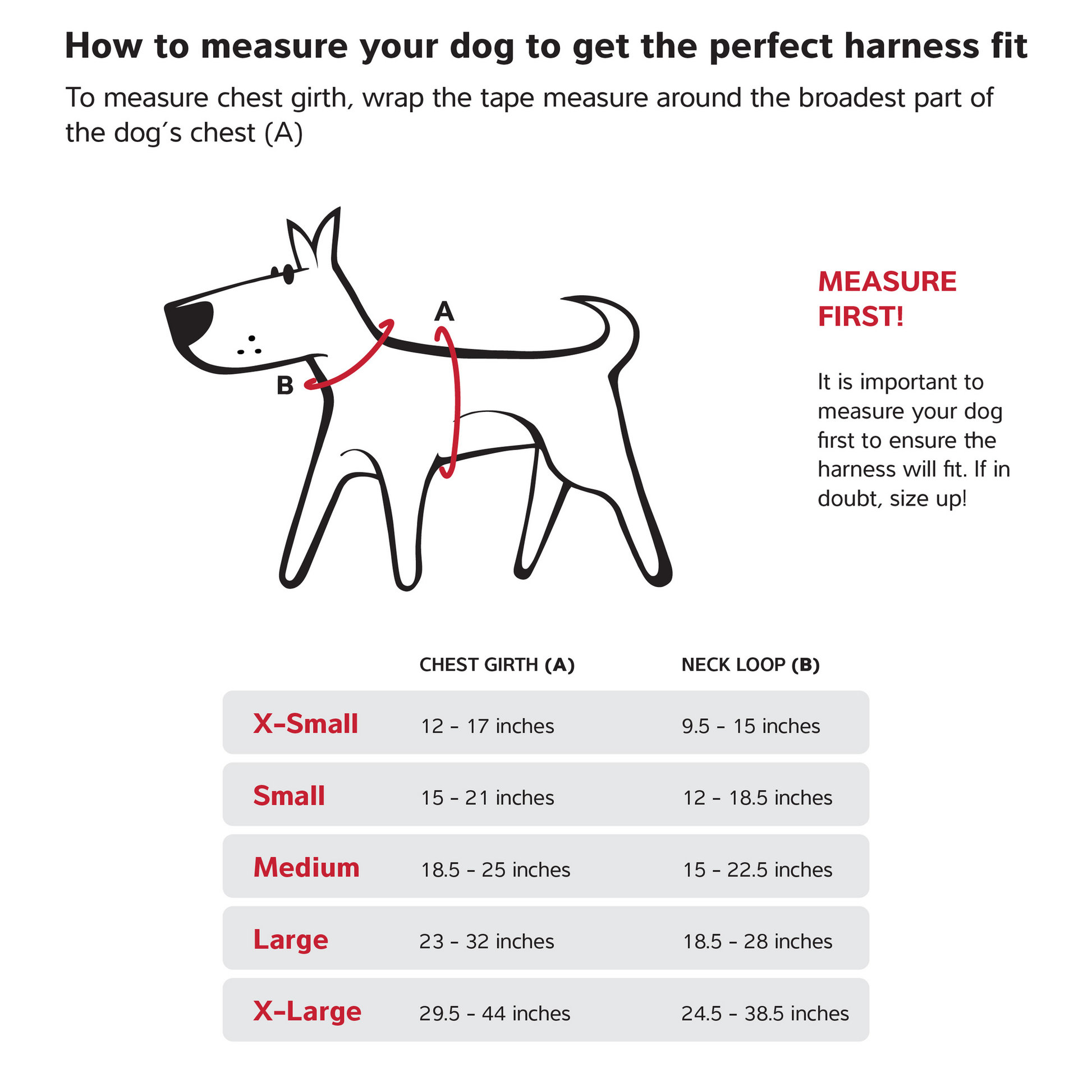 To ensure a safe and comfortable fit, measure your dog's body loop (A) and neck loop (B) and compare it to the size chart below.